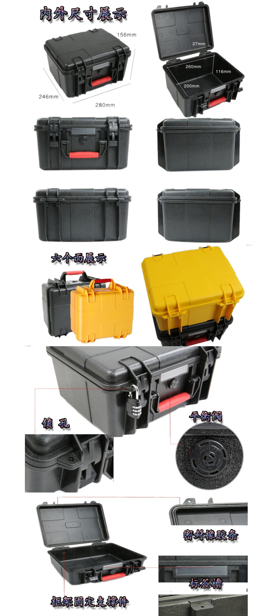 簡要說明:廣泛用于傳媒、公安、消防、軍隊、航空、戶外攝影、野外考察、科學(xué)探測等眾多領(lǐng)域的高端儀器、儀表。具有高強度、高抗壓沖擊、防潮、絕對密封、防塵、防水等特點。產(chǎn)品材質(zhì):ABS原料,箱體采用高抗沖擊的高分子聚合材料一體注塑成型,密封采用扁型彈性發(fā)泡密封橡膠條,確保防水氣密,所有較軸均采用不銹鋼材質(zhì)。