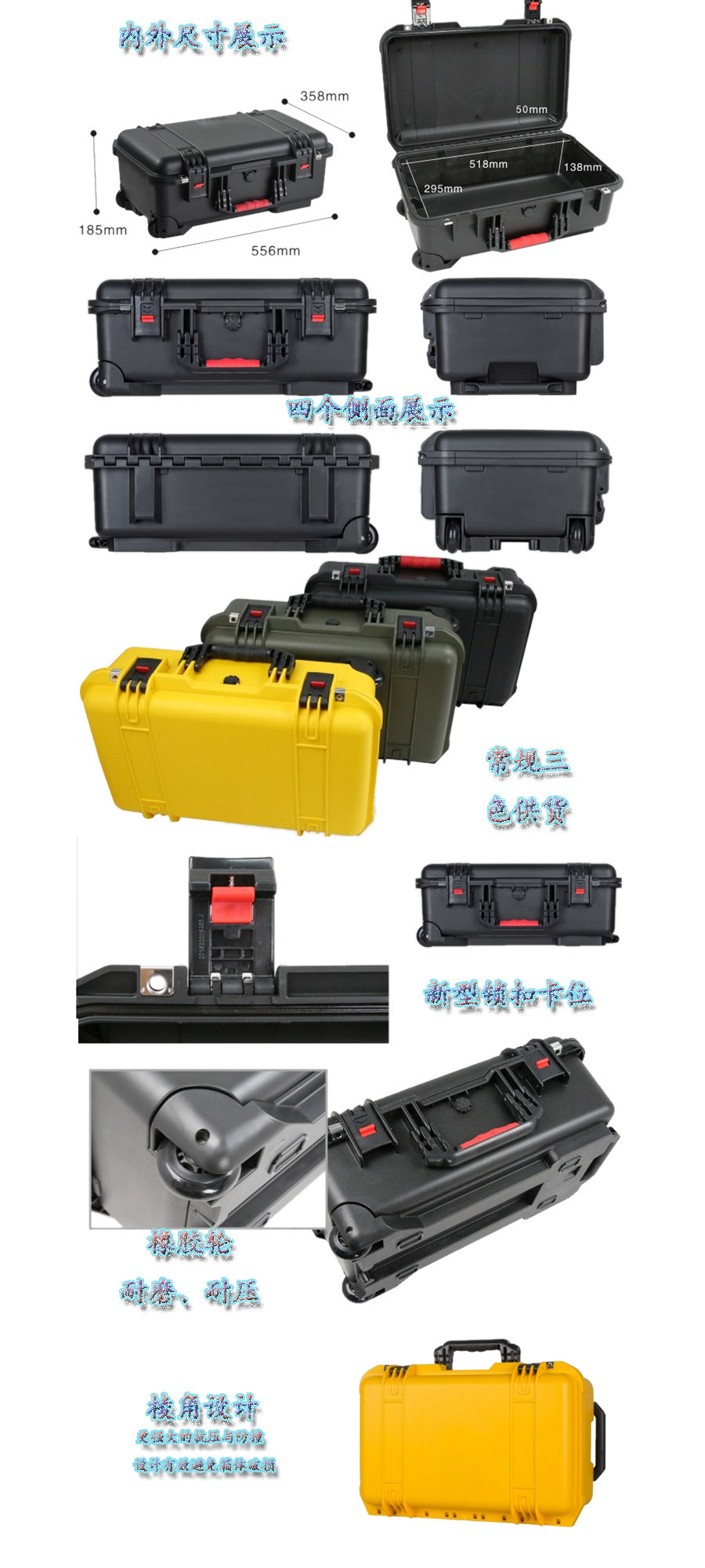 簡要說明:廣泛用于傳媒、公安、消防、軍隊(duì)、航空、戶外攝影、野外考察、科學(xué)探測等眾多領(lǐng)域的高端儀器、儀表。具有高強(qiáng)度、高抗壓沖擊、防潮、絕對(duì)密封、防塵、防水等特點(diǎn)。產(chǎn)品材質(zhì):ABS原料,箱體采用高抗沖擊的高分子聚合材料一體注塑成型,密封采用扁型彈性發(fā)泡密封橡膠條,確保防水氣密,所有較軸均采用不銹鋼材質(zhì)。